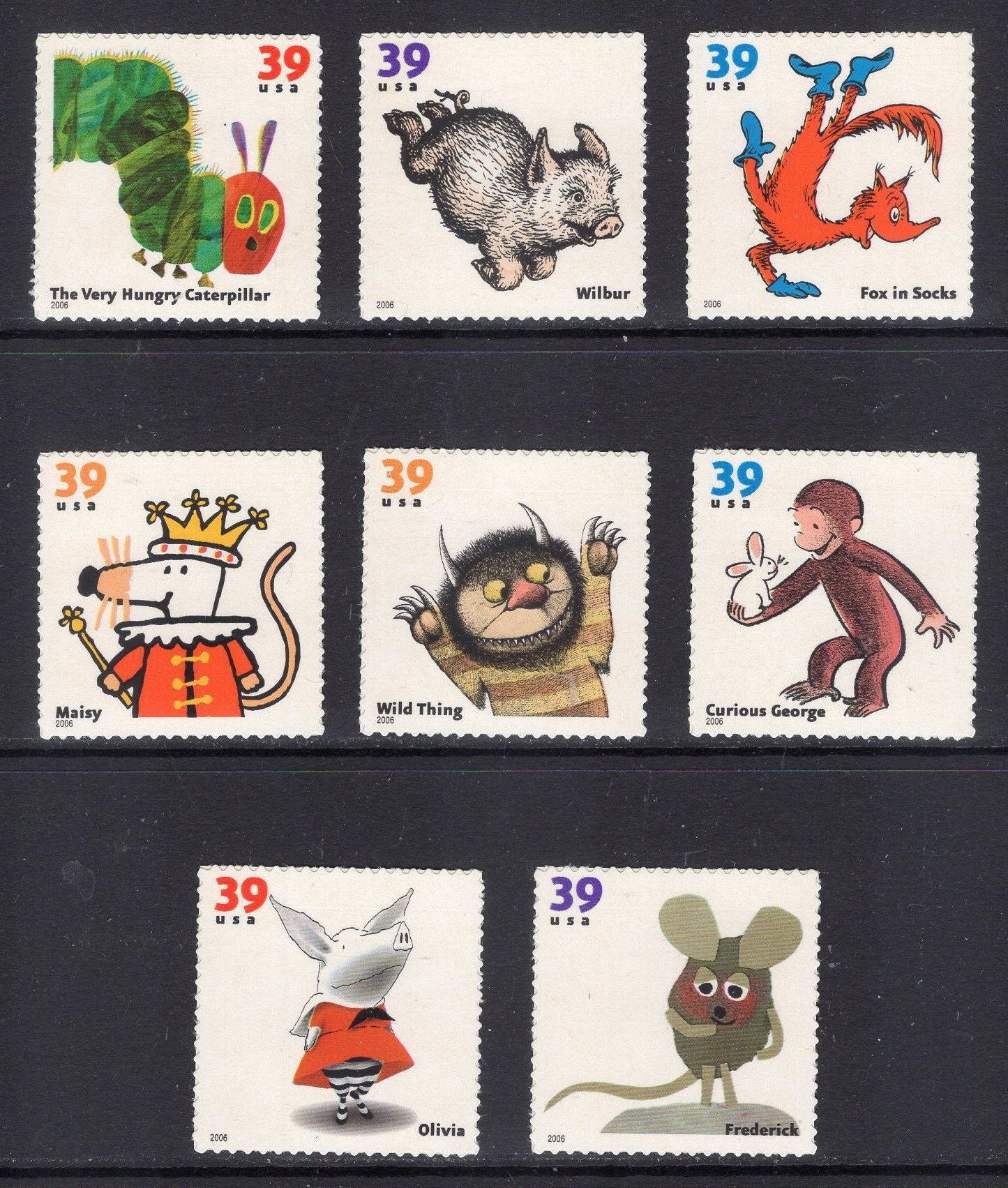 8 CHILDREN'S BOOK ANIMALS inc Curious George Very Hungry Caterpillar Unused Postage Stamps - Quantity Available